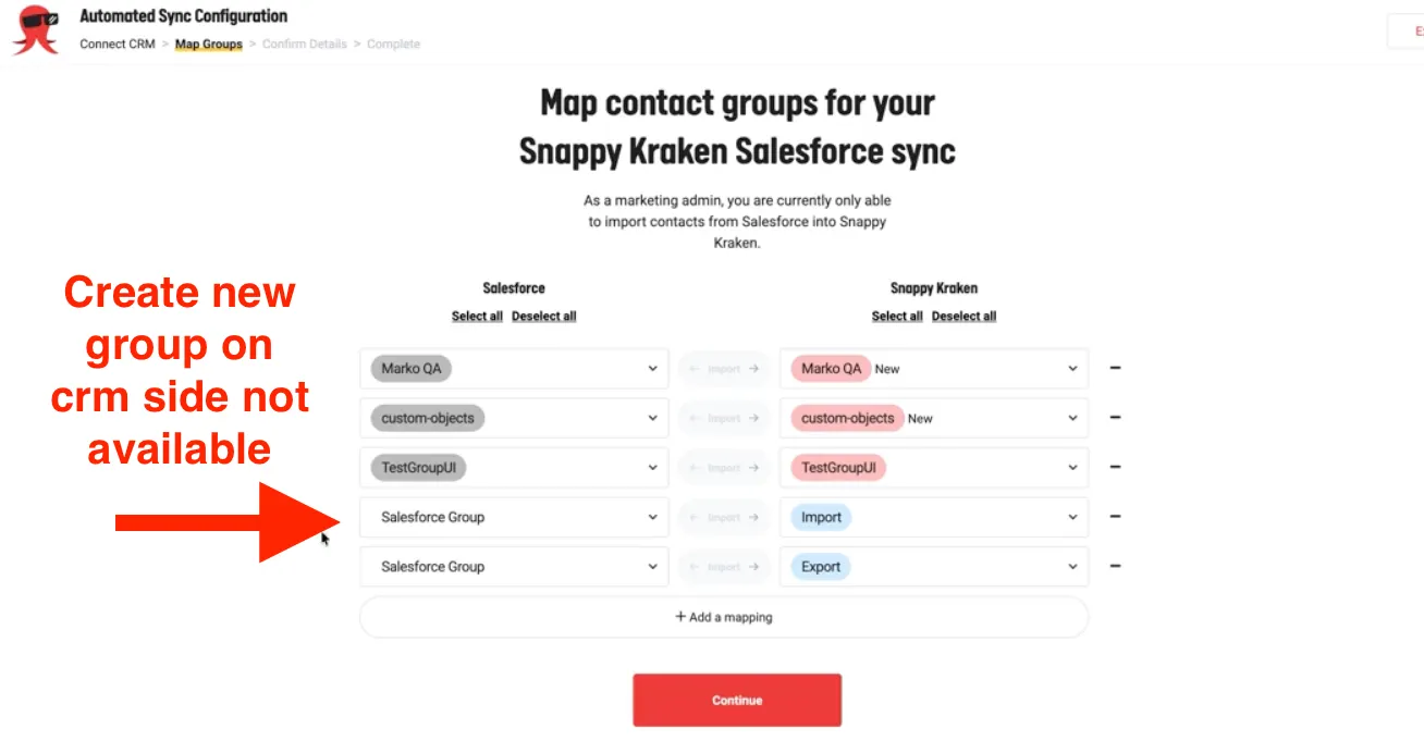 - Marketing Admins cannot create new groups on the CRM side from the contact mapping page