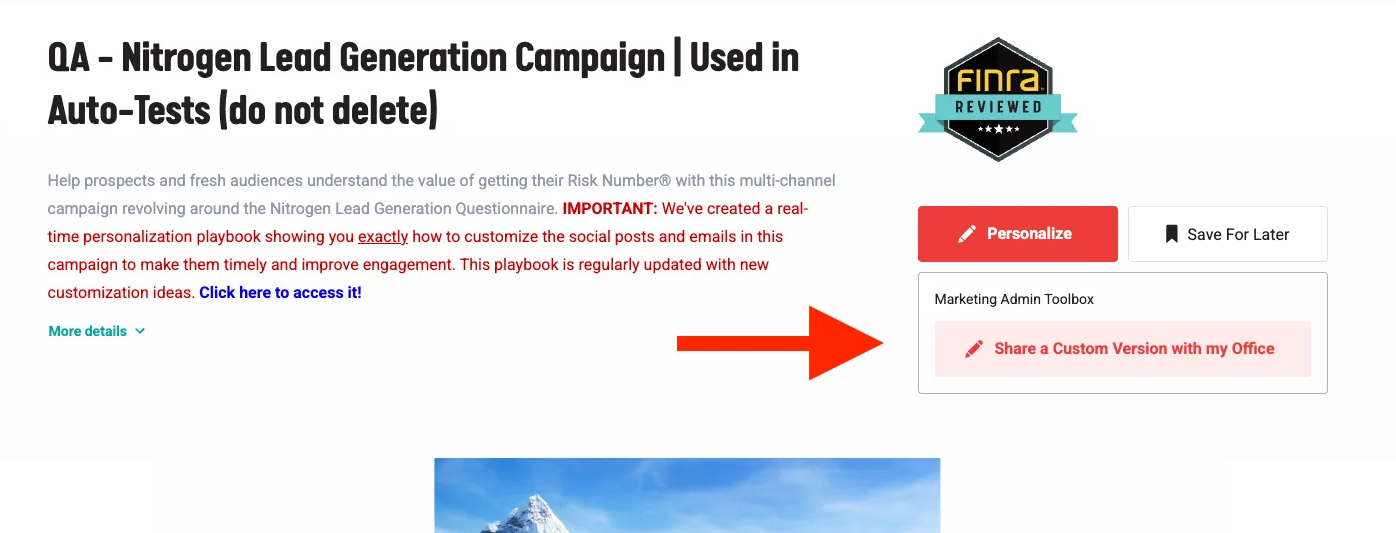 As a Marketing Admin, you can create and share customized campaigns with the advisors you manage. This feature allows you to maintain consistent messaging across your office while still enabling personalization for each advisor.