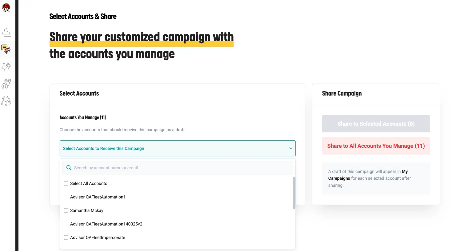 - You must initiate this process from your own Marketing Admin dashboard. You cannot share campaigns while impersonating an advisor account.